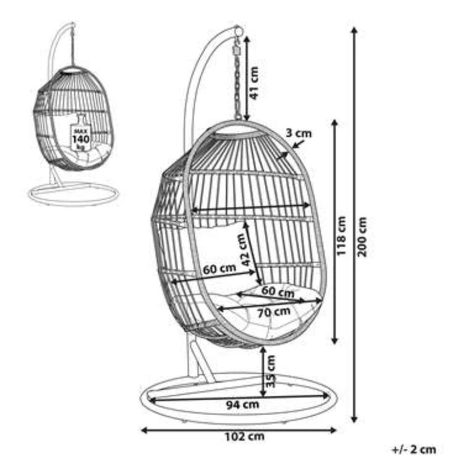 Ronde hangstoel met stalen frame voor binnen en buiten, inclusief kussens. Het opvallende ontwerp van deze hangstoel van robuust polyrotan en polyester zorgt voor een romantisch en zorgeloos vakantiegevoel op de veranda of in de slaapkamer. De gevlochten stoel is opgehangen aan een zware metalen ketting, die op zijn beurt is bevestigd aan een zeer stabiel stalen frame. Zo biedt de stoel rustgevende, subtiele schommelingen en laat je zweven op het comfortabele, waterbestendige zitkussen, zoals op een wolk in de lucht.
