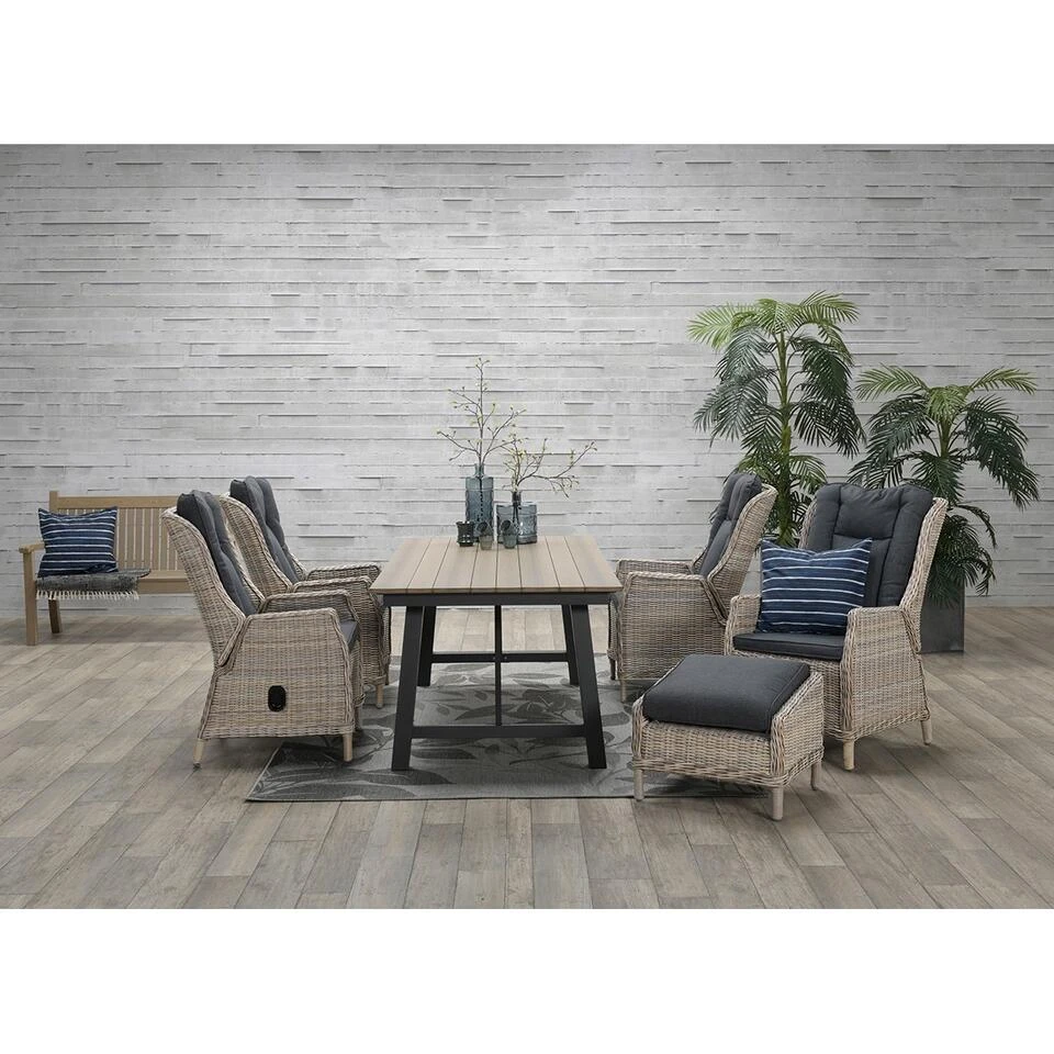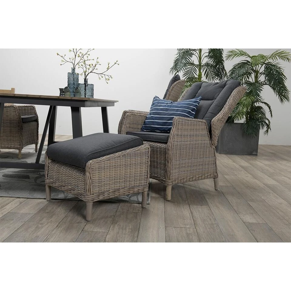 De Marbella verstelbare tuinstoel is vervaardigd uit een onderhoudsvrij aluminium frame en weerbestendig half rond wicker kunststof vlechtwerkdraad in de kleur vintage willow. Het draad heeft een dikte van maar liefst 6,5mm, wat zorgt voor een robuuste uitstraling. Wicker is een stevig en duurzaam kunststof, waardoor je jarenlang kunt genieten van de Marbella stoel.