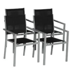 De stoelen zullen een sobere en trendy toets geven aan uw terras. Comfortabel dankzij hun textilene zitting, maar ook robuust tegen de weersomstandigheden dankzij hun aluminium structuur. Ze zijn gemakkelijk op te bergen omdat ze gestapeld kunnen worden. Voor het onderhoud reinigt u ze gewoon met zeepwater en een spons.