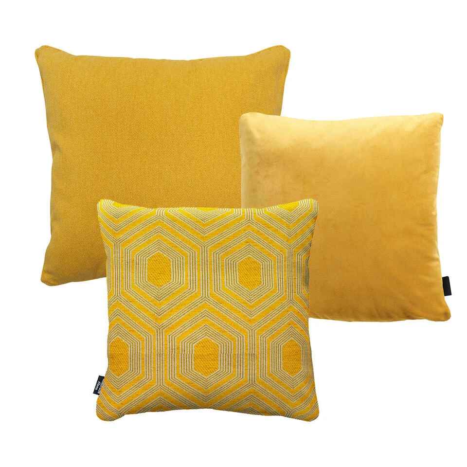 Het sierkussen London geel 45×45 cm is gemaakt van 45 % polyester, 50% katoen en 5% overig materiaal. Sierkussen Boston mostergeel 45×45 cm is gemaakt 43 % polyester, 20% katoen en 37% acryl. Sierkussen Canvas Eco Gold van 50×50 cm is gemaakt van 20 % polyester, 75 % katoen en 5% overig materiaal. De hoezen van de sierkussens zijn voorzien van een rits en is daarmee afneembaar. De kussenhoezen zijn met de hand te wassen in lauw water indien dat nodig is. De sierkussens kunnen gemakkelijk worden opgeborgen met een kussentas. Zo hoef je niet alle kussens één voor één naar binnen te sjouwen. De sierkussens zijn namelijk niet bestemd om buiten te laten liggen